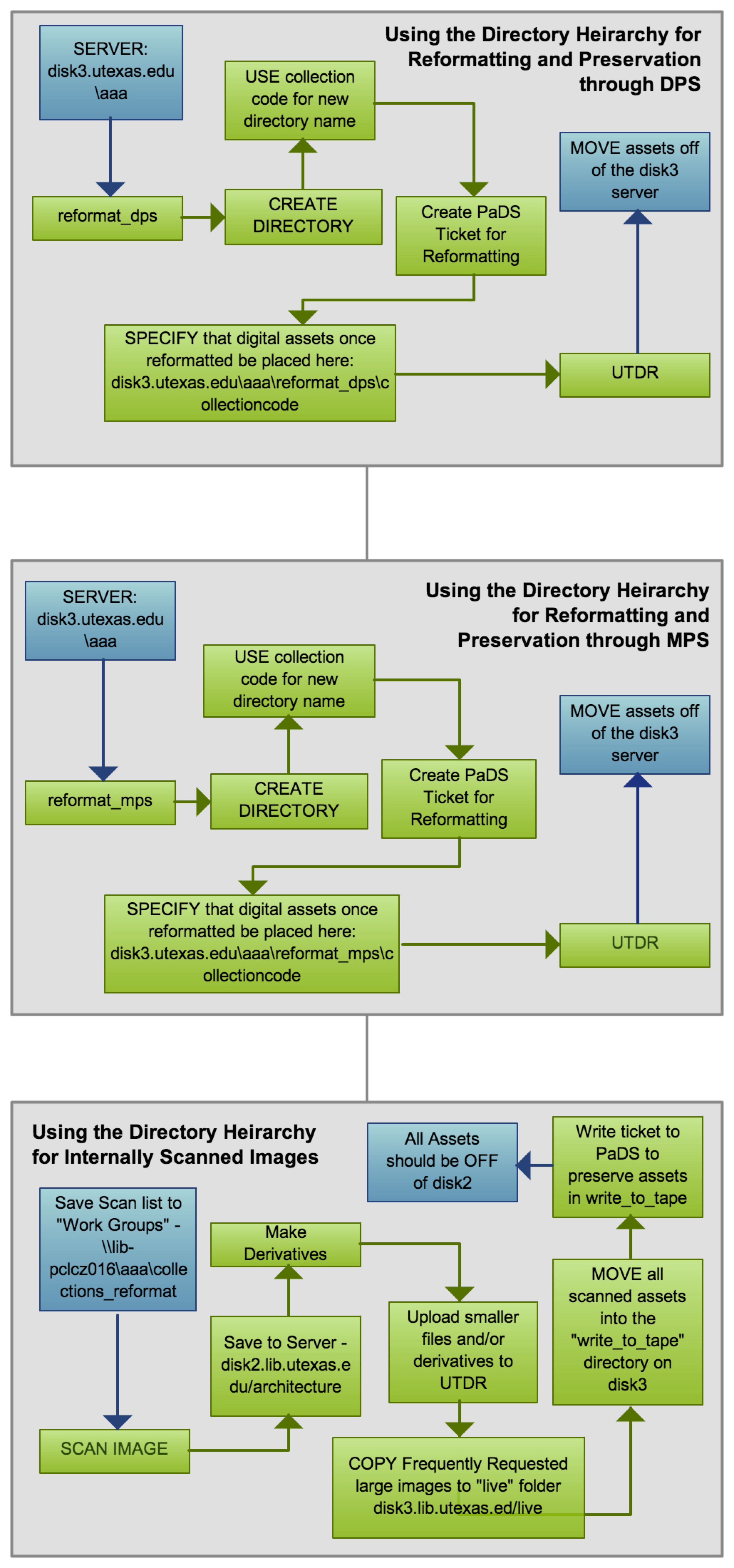Below are some of the workflows developed over the course of the semester. Workflows were based on a previous graduate student’s needs assessment, and were developed through testing these recommendations across several types of digital assets. All of the workflows are meant to provide the staff at the Alexander Architectural Archive methods for managing their digital assets within the UT institutional infrastructure. I also created internal infrastructure by collaborating across the UT Libraries departments, and training material for providing access through UT’s Digital Repository (UTDR).